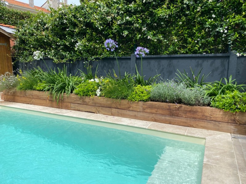 Pour cela nous avons réalisé une jardinière en traverse de Pin sur le coté de la piscine. A coté de cette dernière, nous retrouvons un espace engazonnée pour l'air de jeu des enfants entourée d'une plate bande de végétation varié avec notamment des plantes grimpantes sur les murs de clôtures. Nous y retrouvons une végétation qui